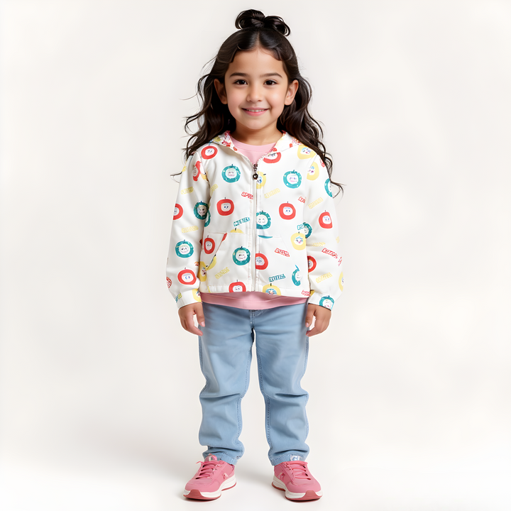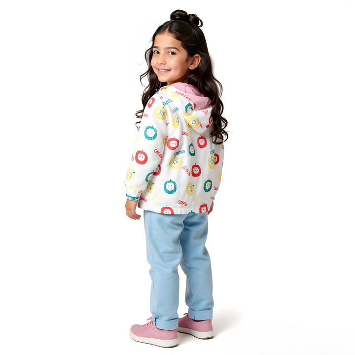 Brighten up chilly days with our charming girls' white zipper winter jacket, featuring a playful design of vibrant green, red, and yellow apples.