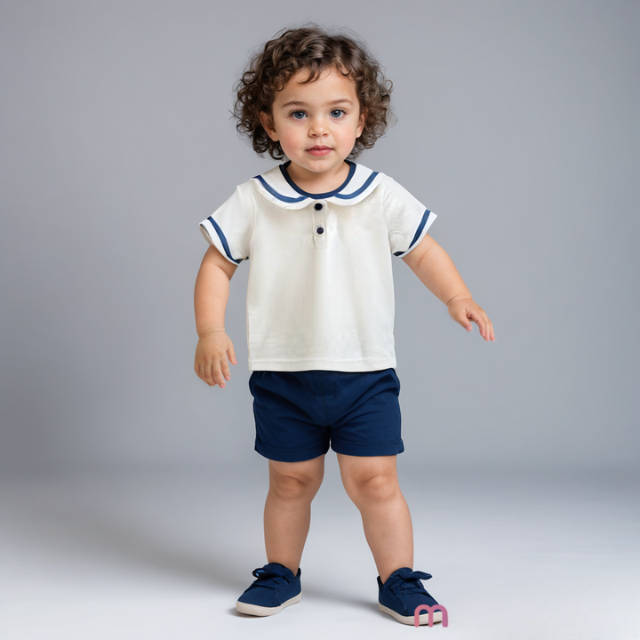 - Naval collar with three rows of blue tape on the collar and sleeves that complete the sailor look.